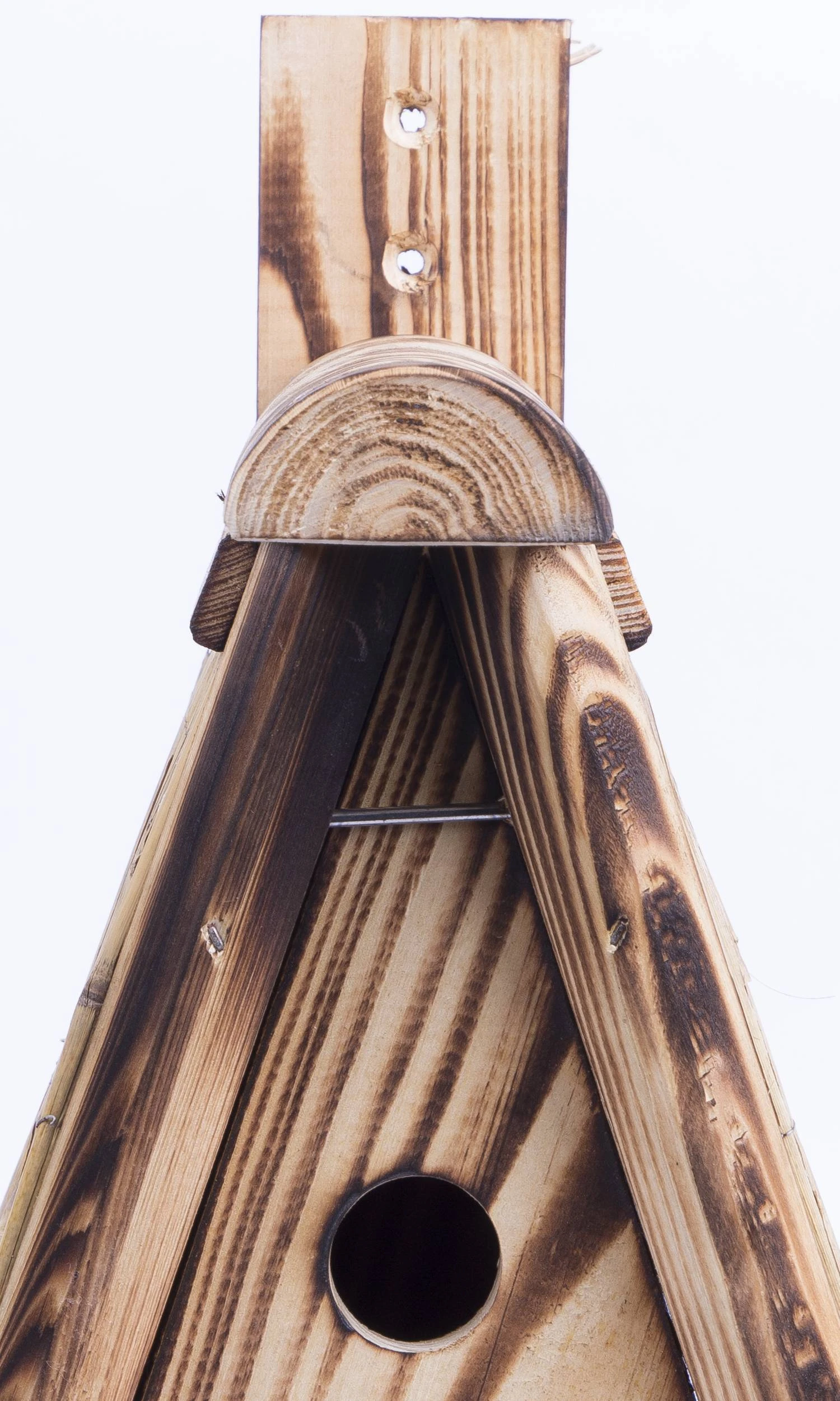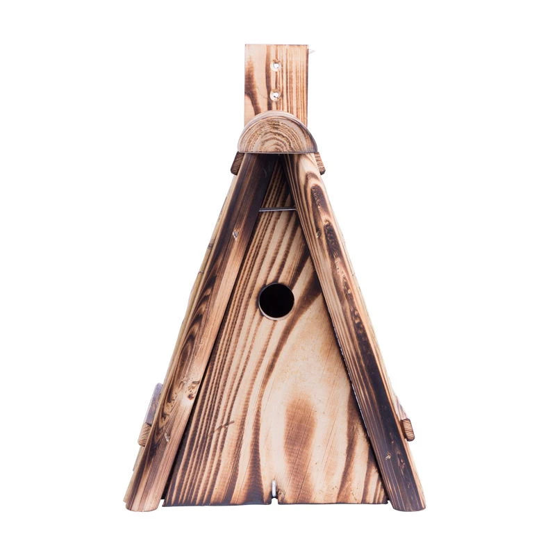 Vielseitiger, dekorativer Kölle Nistkasten, der verschiedenen Wildvögeln einen geeigneten Nistplatz bietet. Der Nistkasten wurde aus Fichtenholz gefertigt und mit einem Dach aus Folie und Stroh gedeckt.